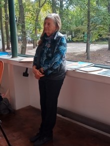 Fotos de Inés, hija de Amancio y Delfina dando una entrvista a medios locales. A la izq. al lado del hogar restaurado, (notese el la forma de lira donde van los leños) y a la derecha contra el ventanal con su carpinteria totalmente abierta.